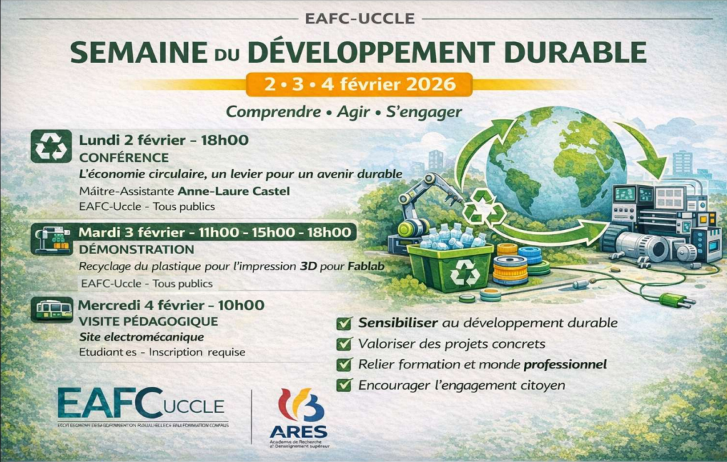 Cette semaine dédiée au développement durable illustre la volonté de l’EAFC-Uccle de former des professionnels conscients des défis actuels et capables de participer activement à la construction d’un avenir plus responsable.